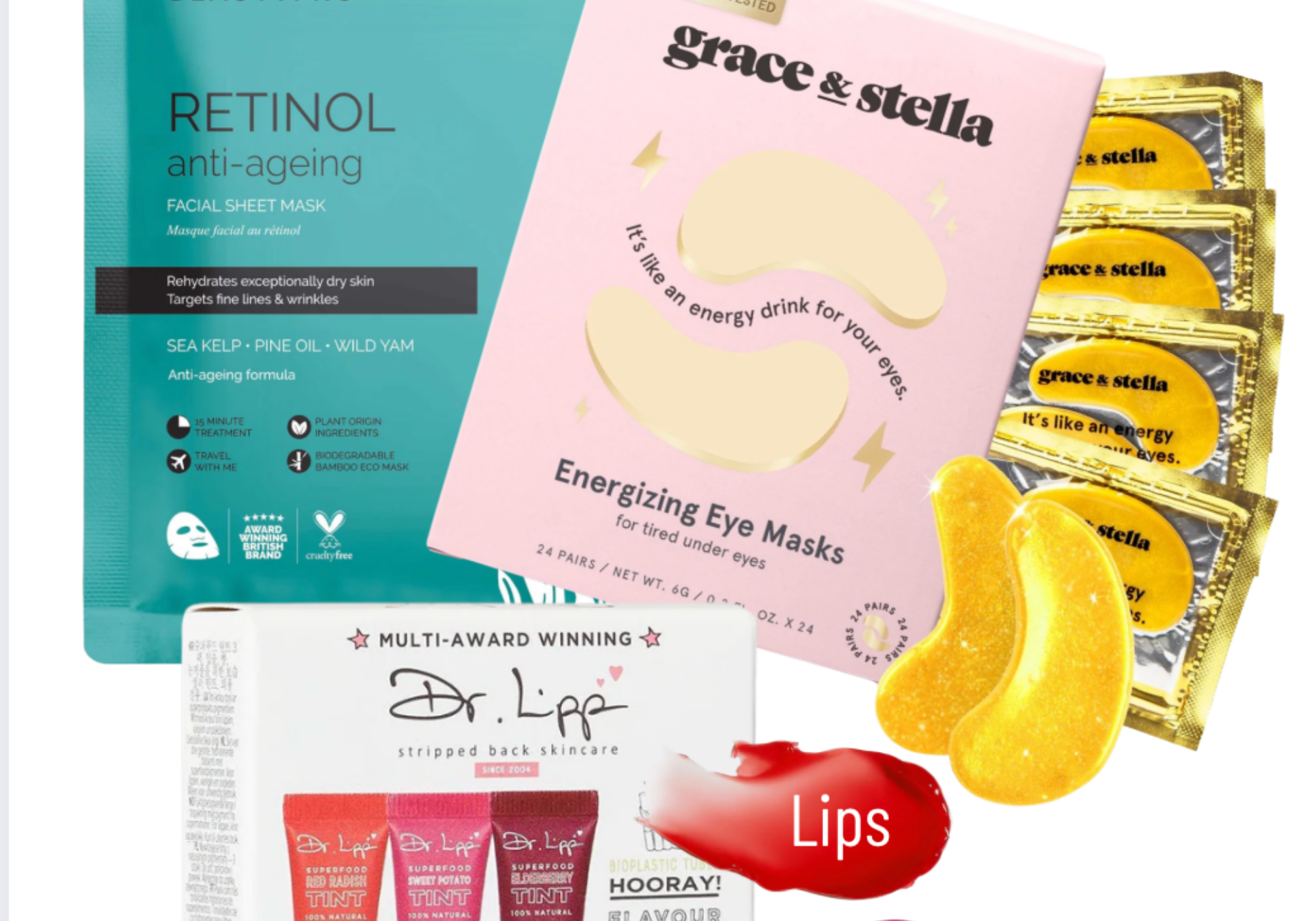 This festive beauty bundle includes 24 Grace & Stella Energising Under Eye Masks, a BeautyPro Retinol Sheet Mask, and a Dr. Lipp Lip, Cheek & Eye Tint Trio. The perfect mix for Christmas glam, thoughtful gifting, or stocking fillers that deliver glow, hydration and holiday-ready radiance.